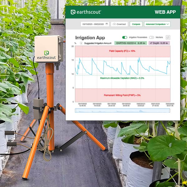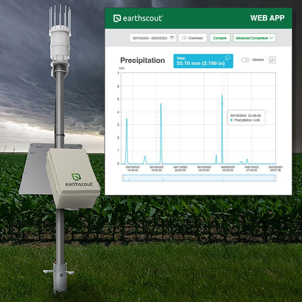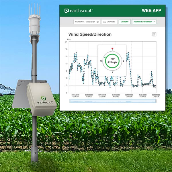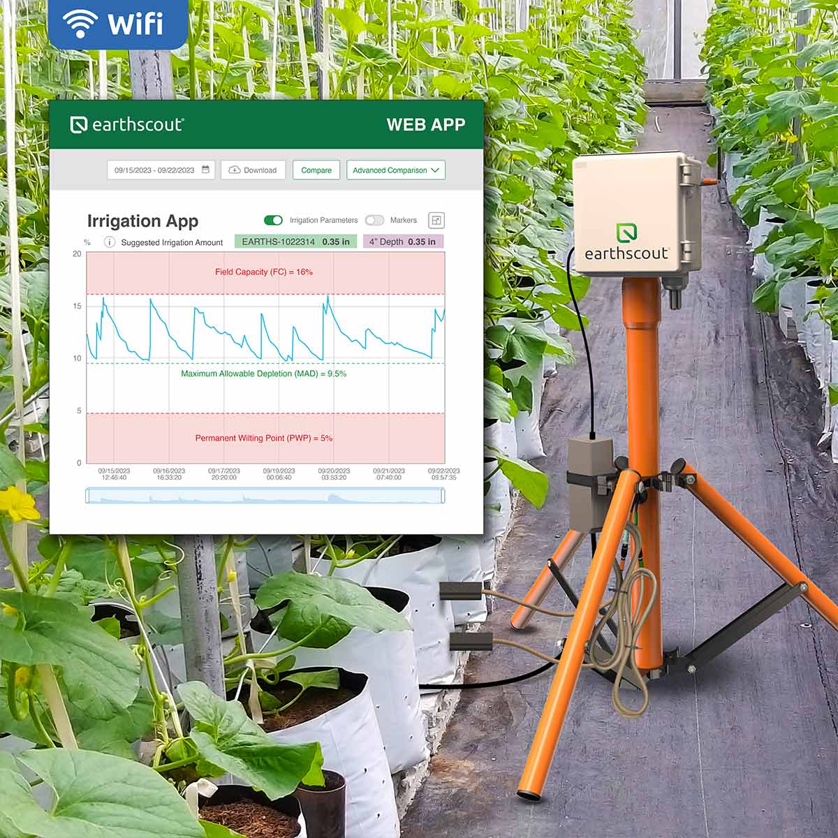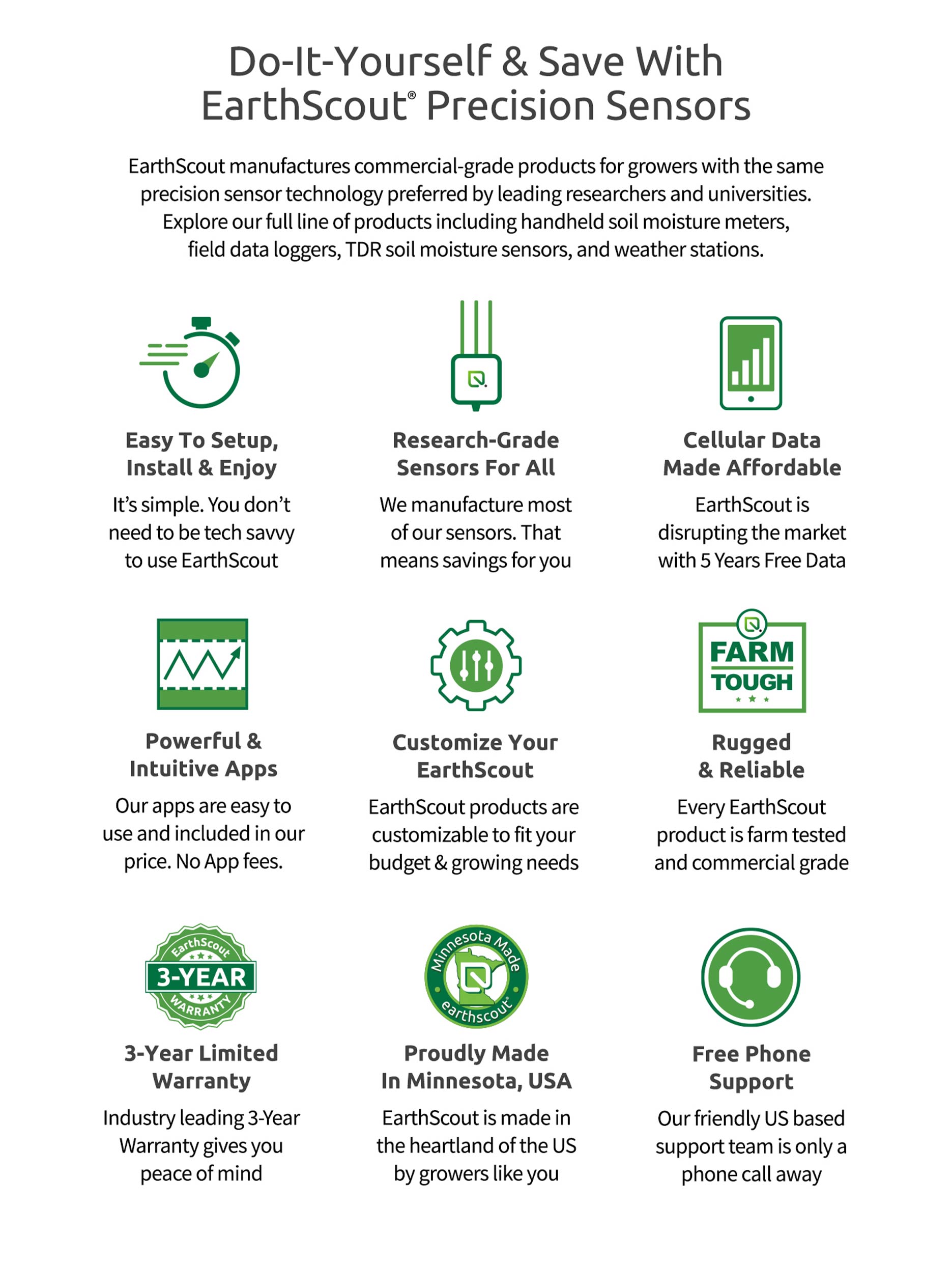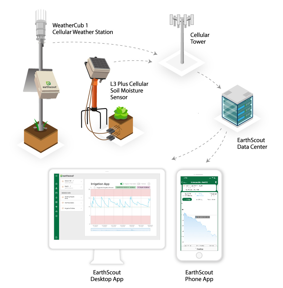 Use this simple approach to dial in your irrigation, prevent leaching, and grow healthier crops. Also available is our popular WeatherCub 1 Cellular Weather Station which monitors 11 hyper local weather variables and sends the data to the EarthScout App – including precipitation, wind speed, wind direction, air temperature, and humidity. To learn more, schedule a call, or contact us today at 1-877-443-7632.