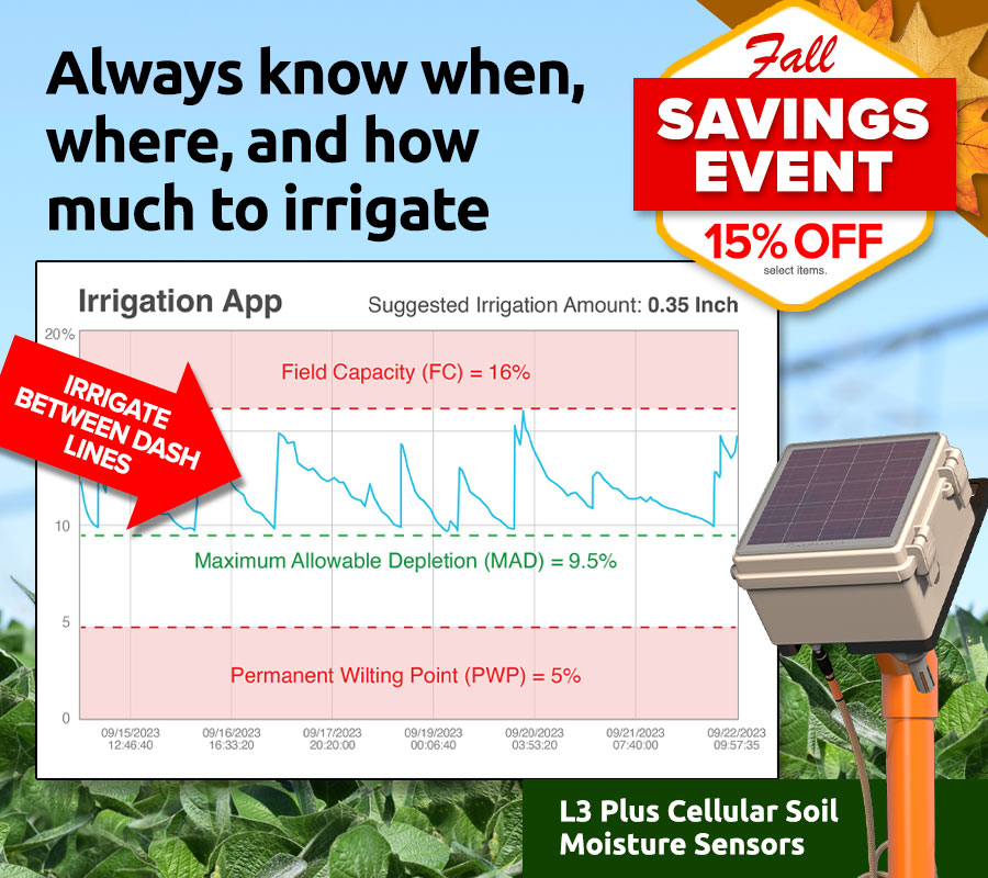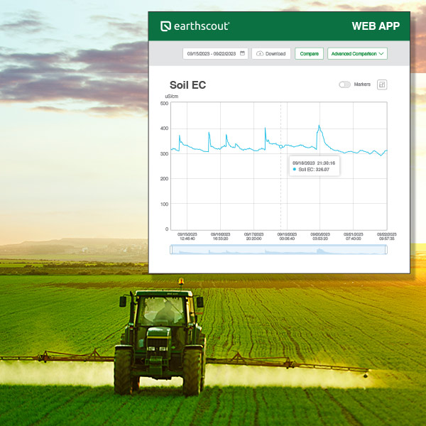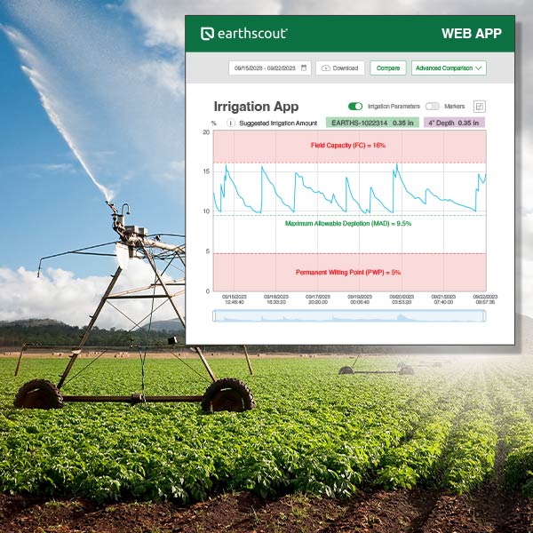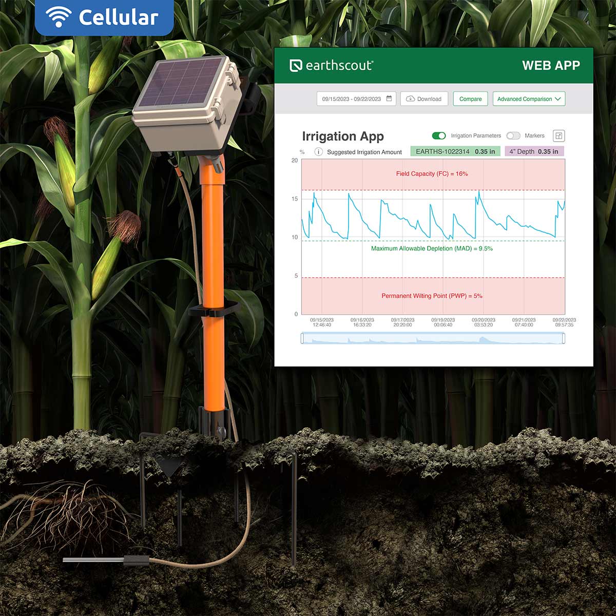 Save on pivot and drip irrigation costs with the EarthScout Irrigation App and Cellular Soil Moisture Sensors.