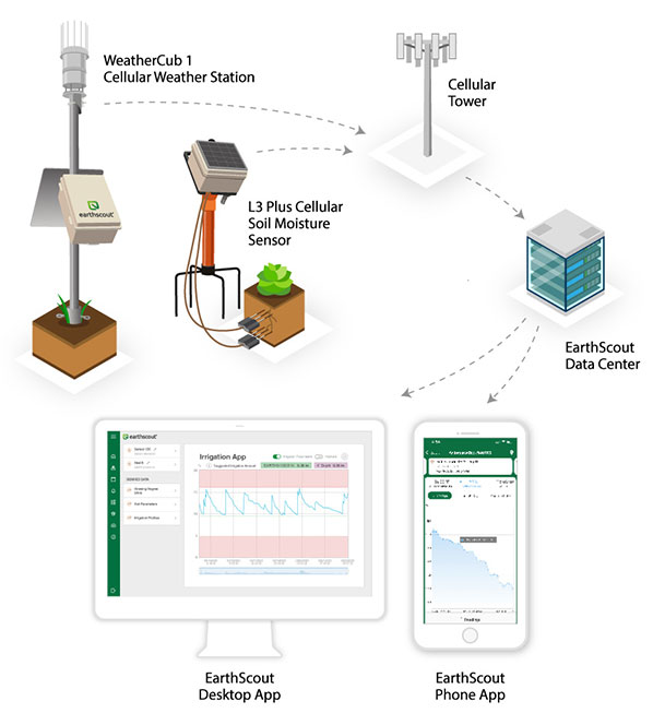 EarthScout® was born as a result of meeting with hundreds of growers like you who were seeking an affordable IOT smart agriculture solution to help them conserve water, reduce irrigation costs, and simplify their irrigation management efforts. Our easy-to-install cellular soil moisture sensors and weather stations capture multiple data points in your soil and growing environment – giving you real time field information across zones. Field data is instantly communicated using cellular technology to your phone and laptop, and visually displayed in our easy to use EarthScout Irrigation app, helping you Grow Smarter™.